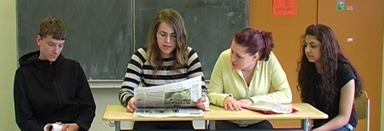 1. Szene: „Erziehung früher“: Der Vater kommt nach Hause und lässt sich von seiner Frau bedienen. Sie gibt ihm die Zeitung und kocht. Die Kinder kommen aus der Schule. Die Tochter hat schlechte Noten, der Sohn gute. Die Mutter schimpft...