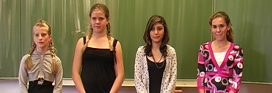 Vier Schülerinnen der Klasse mit vier verschiedenen Muttersprachen sagen hintereinander Sätze in den Übersetzungen ihrer Sprache (deutsch, polnisch, russisch, kurdisch)...