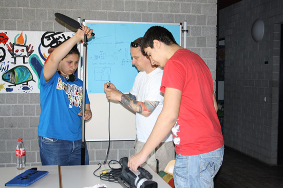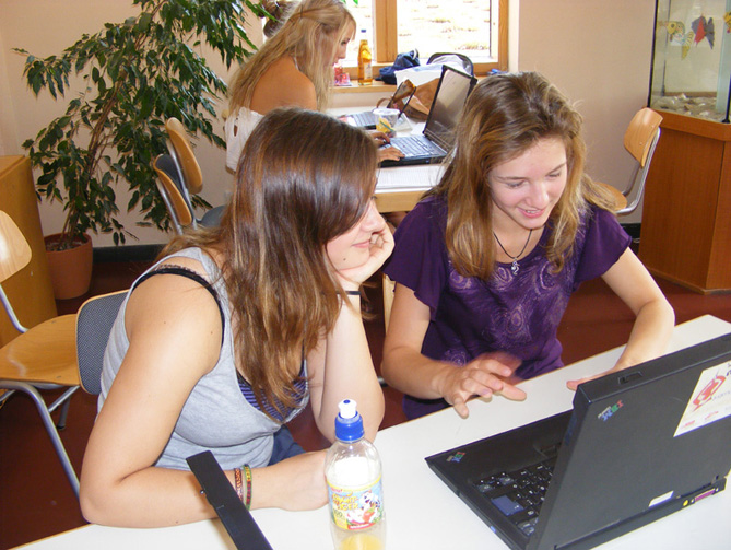 In allen drei Gruppen laufen an den letzten beiden Tagen die Arbeiten auf Hochtouren. Die Videogruppe beginnt gerade, ihr Material auf dem Rechner einzuspielen, damit anschließend der Schnitt in Angriff genommen werden kann.