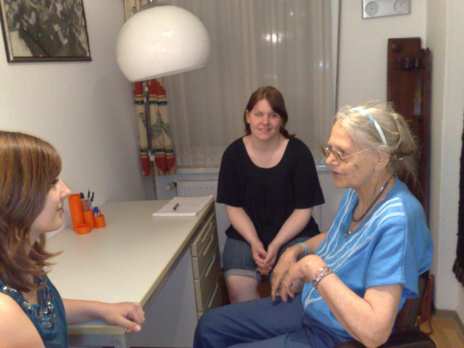 Sabrina und Lara sind im Heimatmuseum Steglitz und interviewen Edmuth Kuckenburg-Knothe, die früher der Wandervogelbewegung in Steglitz angehörte.