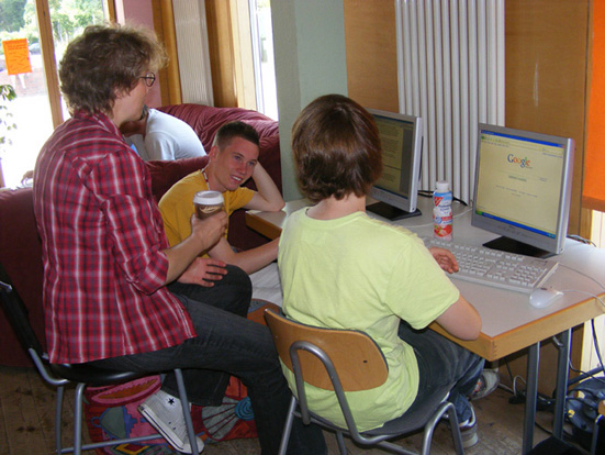 Derweil auch die "Journalistenteams" auf der Jagd nach Informationen in Steglitz umherschwirrten, schwitzten die Jugendlichen der Literaturgruppe bei einer Affenhitze über ihren Texten am Computer. Philipp und Samuel erdachten eine Fantasiegeschichte über zwei Hunde namens Udo und Heinz. "Die Hitze ist echt kaum auszuhalten, wir hätten schon ganz gern ein paar Ausflüge gemacht wie die Anderen, um uns z.B. Ideen zu holen"; erklärten die beiden Jungs, die mit Teamer Markus trotzdem viel Spaß hatten.