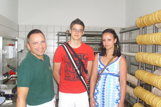 Michelle und Tobi führte ihre Recherche in den Traditionsbetrieb Rabien. Hier mit Konditormeister Michael Göring - und leckeren Baumkuchen (hängend, rechts).