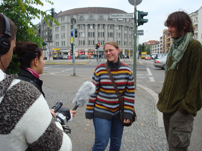 Am Platz der Luftbrücke startet die Gruppe dann eine Straßenumfrage. Wir wollen wissen, wie die Bürger die Zukunft des Flughafens sehen. Touristen aus England, die wir befragen, nutzen den Park für Freizeitaktivitäten. Ein Tempelhofer hätte den Flughafen lieber behalten. Dieser Meinung sind auch zwei ältere Passanten, die dort früher gearbeitet haben.