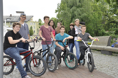 Gruppenbild mit Bike: Tom, Jonas, Victor, Paulina, Wiebke, Noah, Jennifer, Mira und Steven (v.l.).