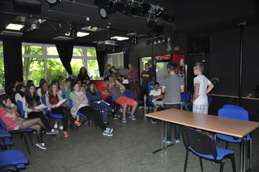 Die Gruppe der Kreativen Schreiber nutzt die ersten Tage der Projektwoche, um Ideen für eigene Geschichten, musikalische Collagen und kurze Spielszenen zu entwickeln. Danach geht´s ans Schreiben und für einige auch ans Proben des szenischen Stücks, welches das schwierige Verhältnis eines pubertierenden Mädchens und seiner Eltern thematisiert.