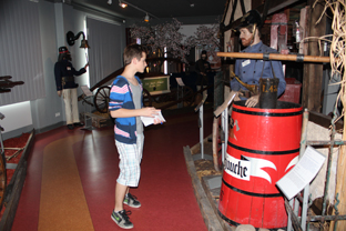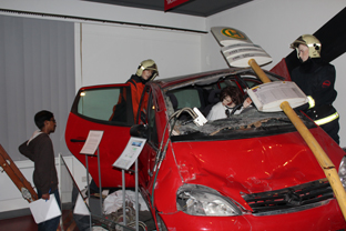 In den verschiedenen Ausstellungsbereichen des Museums erwarten Armind und Gimhan auf einer Fläche von mehr als 800 Quadratmetern technische Errungenschaften in Form von sehr anschaulichen Exponaten aus der 160jährigen Geschichte der Berliner Feuerwehr von ihrer Gründung bis in die Gegenwart. Interessiert und mit einem Block für ihre Notizen ausgestattet, treten die beiden jungen Reporter ihre Entdeckungsreise an. Zu sehen sind u.a. Uniformen, Fotos und Modelle von Spritzen- und Gerätewagen sowie Feuerwehren aus allen Zeiten, historische Hydranten und Feuermelder, Dienstgradabzeichen, Rauch- und Gasschutzmasken, Modelle von Feuerlöschbooten und vieles mehr. Besonders beeindruckt sind die beiden Jungen von den nachgestellten, aber realistisch wirkenden Gefahren- und Unfallsituationen.